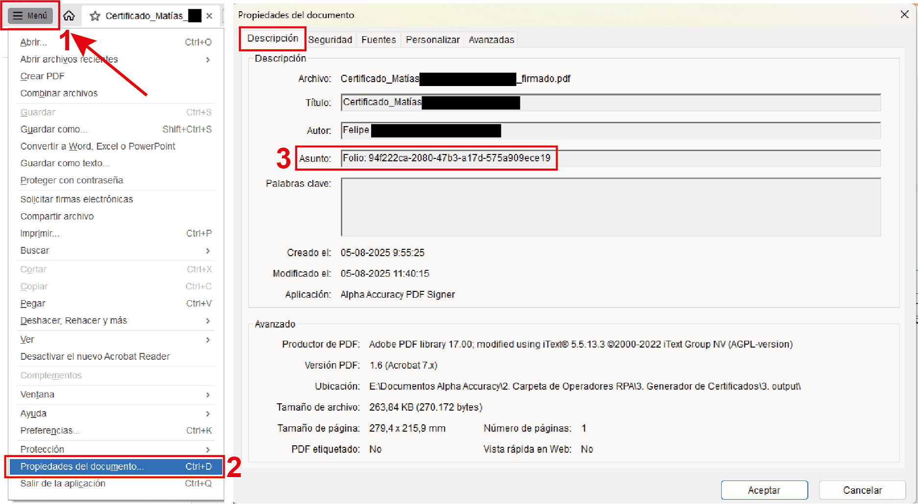 - Propiedades del PDF: Si abres el documento en un lector PDF (como Adobe Acrobat), puedes encontrar el folio en el campo “Asunto” (Subject) dentro de las propiedades del documento.